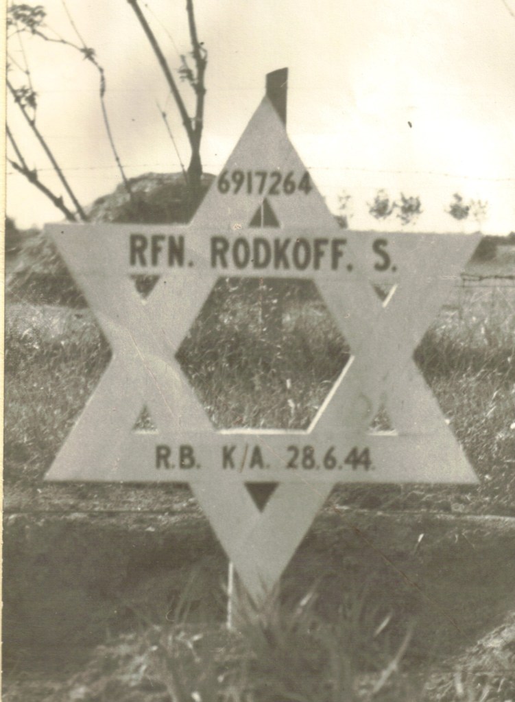 The man is my father-in-law to be, Myer Rodkoff. The woman is Sally, nee Sarah Bloom, the widow of Soloman Rodkoff. In the year that marks the 75th anniversary of his death, in Normandy on 7 Tammuz 5704, on 28 June 1944, this is his tribute.