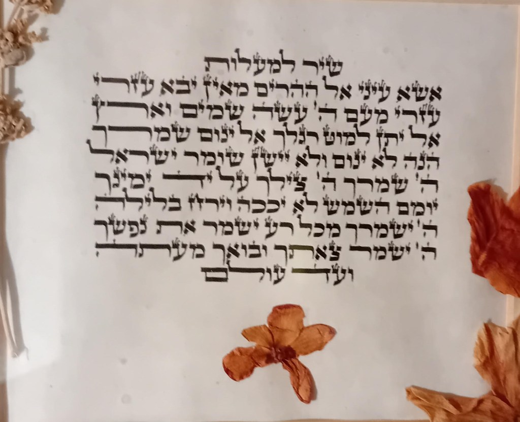 Finally, my all-time favourite: Psalm 121, the Yosef Karduner version[3] – a world away from the churchy tune which usually gets sung at shivas – I raise my eyes to the hills, where my help comes from. Karduner, a Hasid with guitar, belts it out with feeling.The framed text of the psalm, decorated with dried flowers, handwritten by a scribe, has hung on our wall for the past 40 years, a constant presence throughout the ups and downs of our own lives.